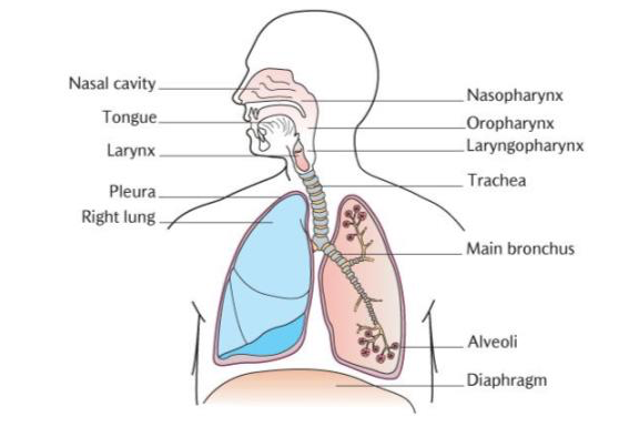 The respiratory system also includes the trachea (windpipe), muscles of the chest wall and diaphragm, blood vessels & other tissues